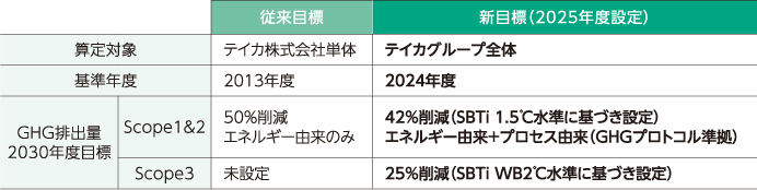 気候変動への対応をさらに進めるには、サプライチェーン全体でGHG排出量削減に向けた取り組みが必要であることを鑑み、テイカグループにおけるGHG排出量に関する2030年度目標を右記のとおり見直しました。