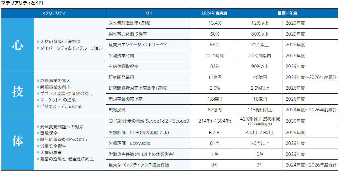 テイカグループは、2021年度に経営として取り組むべきマテリアリティを特定しました。より持続的な企業価値の向上に努めるため、2025年度にマテリアリティの見直しおよびKPIの策定を行いました。絞り込んだマテリアリティは、心(熱意)・技(化学力)・体(基盤)に分類しています。
